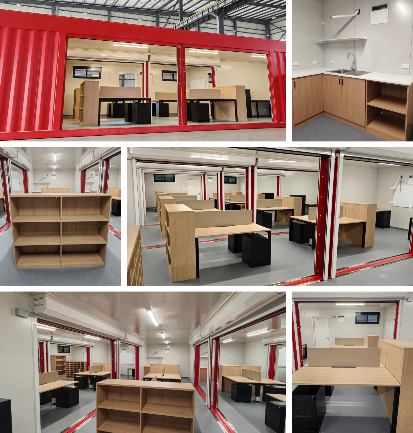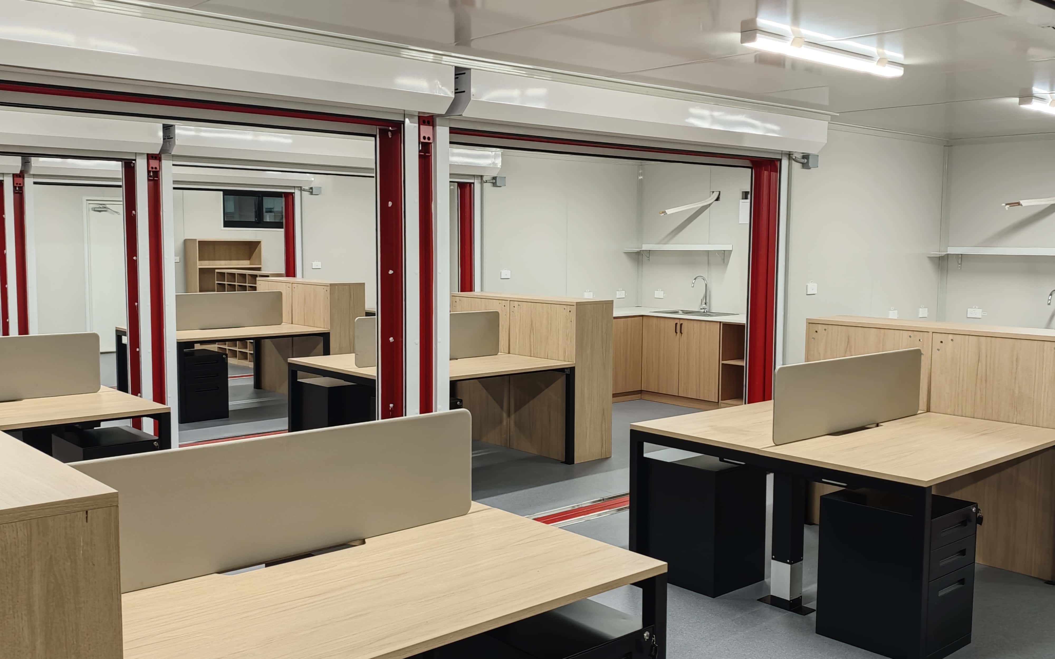 What's more, all essential furnishings are pre-integrated at the factory, including desks, cabinets, filing cabinets, whiteboards and kitchen cupboards.